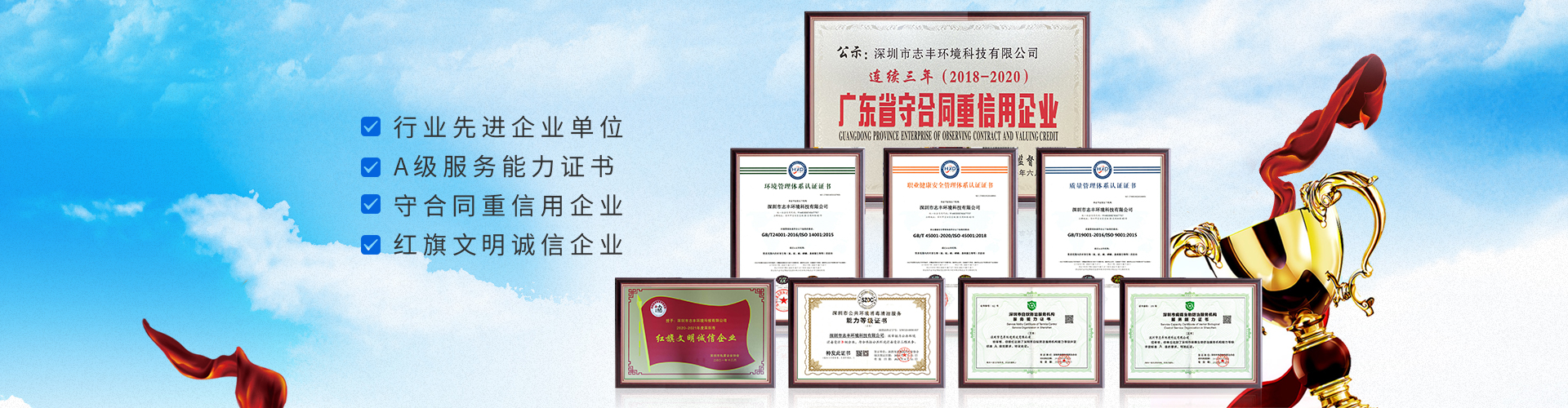 志豐環境是客戶的信賴選擇,被深圳是市場監督管理局、深圳市私營企業協會授予”廣東省守合同重新用企業“和”紅旗文明誠信企業“。