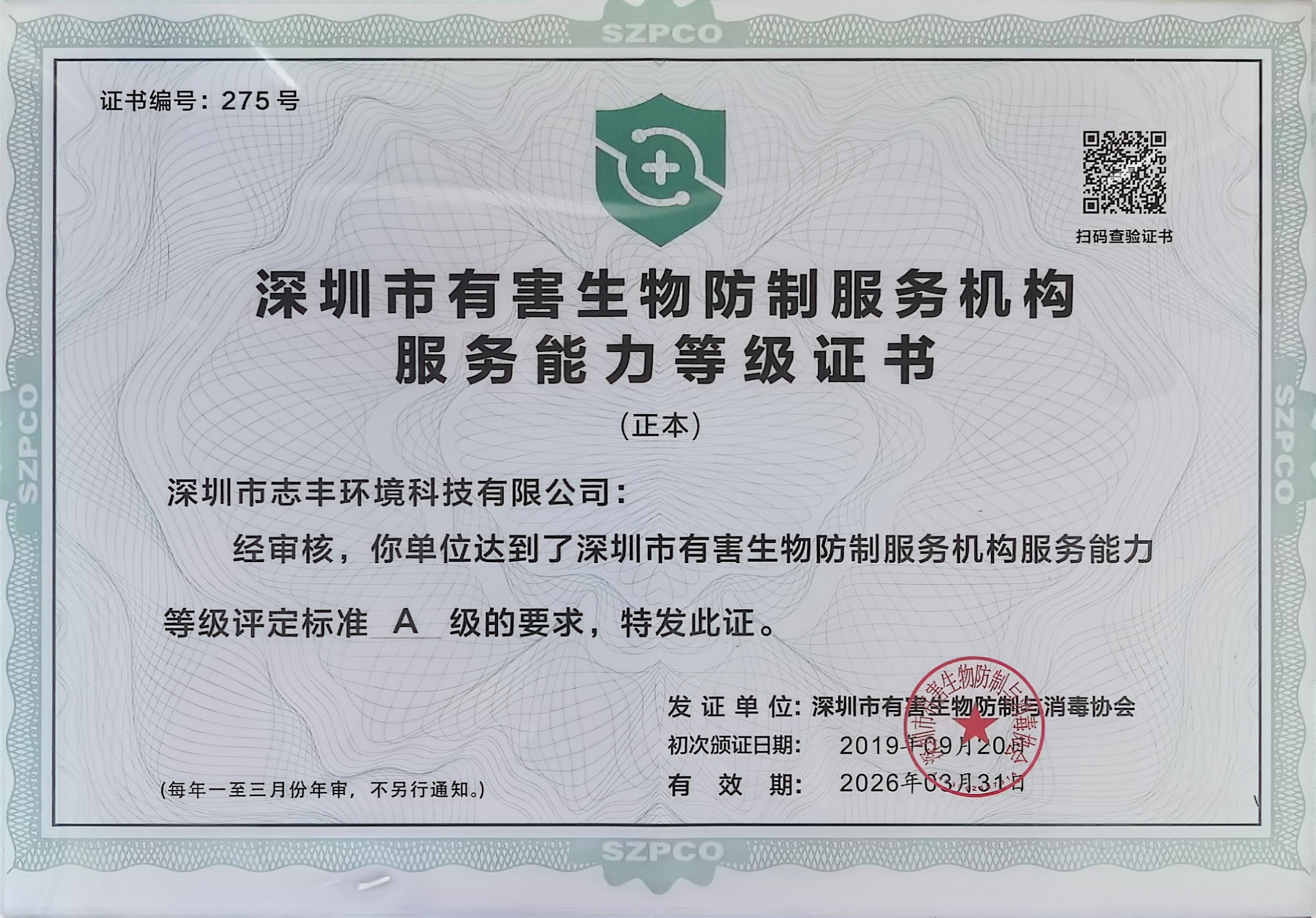 深圳市有害生物防制機構A級服務能力證書